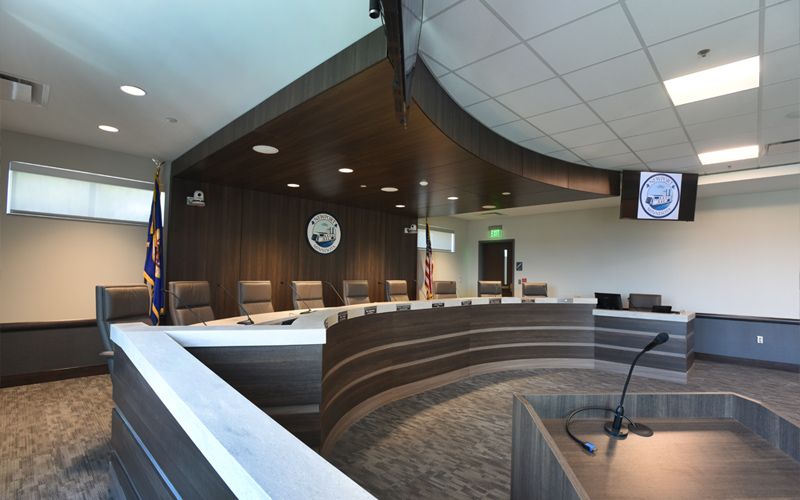 This combination facility integrates three municipal functions seamlessly under one roof. The City Hall has a large council chamber, private offices, and a public service counter. The Police Department has interview rooms, evidence sorting, and two squad car bays. The Fire Department has 10 apparatus bays, emergency operations center (EOC), combination hose/training tower, laundry facilities, pressurized SCBA room, a day room, steam showers, and an ICC 500 rated storm shelter. The building also incorporates a training room, exercise room, a warming kitchen, conference rooms, and an outdoor seating area. The municipal building’s exterior is constructed of precast panels with inlaid brick and stone, giving a strong and timeless appearance.