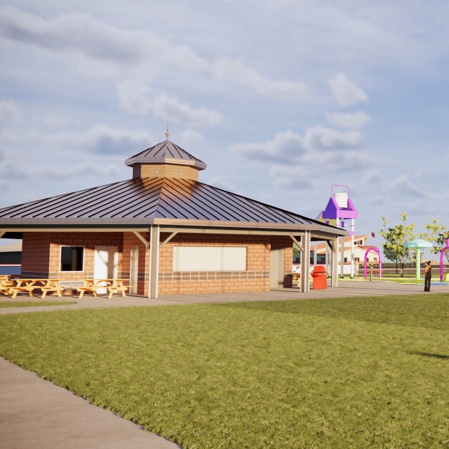 The project site covers 10+ acres. The sports complex consits of a football and baseball field with bleachers and press box, an ice rink and warming house, concessions, an outdoor splash pad, two sand volleyball and basketball courts, a skate park, and a full spectrum of track and field facilities. The goal for the site was to create a shared, flexible, athletic and leisure space capable of accommodating numerous types of community activities.